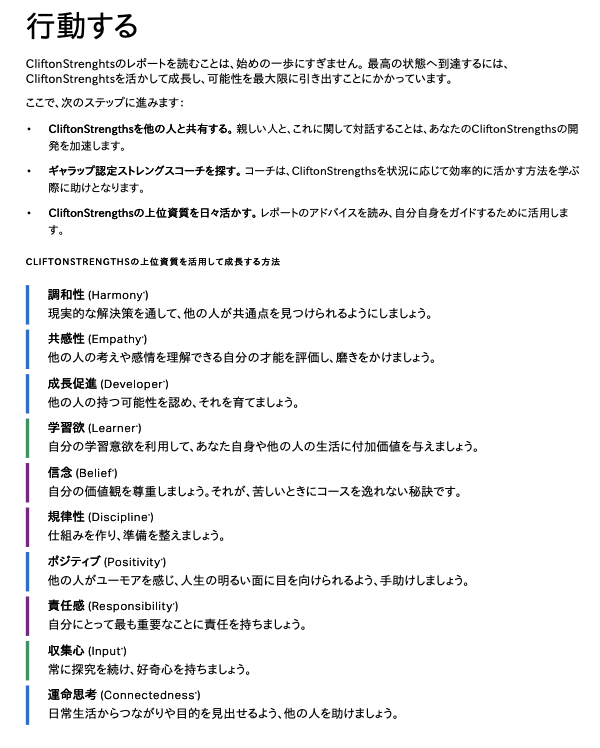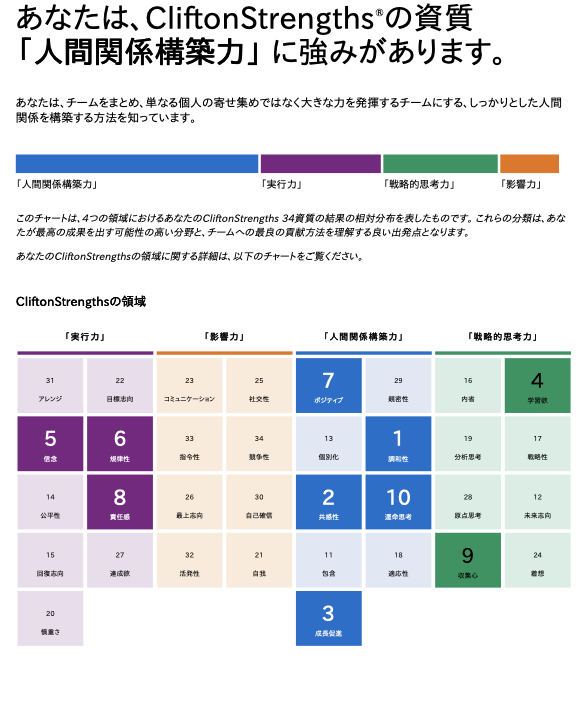 1〜10位までの上位資質の結果から、人間関係構築力に強みがあること。基本的にはポジティブな精神状態を持ち、他人を元気づけ、強い責任感と好奇心で前に進んでいくような人物というのがわかりました。